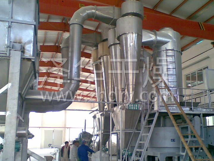 流化床干燥機是由物料自進料進口進入機內(nèi),在振動力作用下,物料沿水平面流化床拋擲,向前連續(xù)運動,熱風向上穿過流化床同濕物料換熱后,濕空氣經(jīng)旋風
